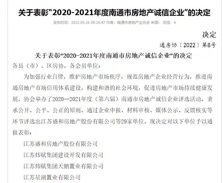 近日,南通市房地产业协会公布了关于表彰“2020-2021年度南通市房地产诚信企业”的决定。决定指出,协会秉承公开、公平、公正的原则,通过企业申报、材料审核、媒体公示、反馈核实等环节评选出必赢242net官网等29家单位,予以通报表彰。