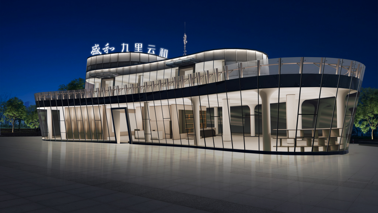 九里云和项目临时售楼处坐落于通扬运河与通吕运河交汇处,总占地面积约460平方米,总建筑面积(含露台)约880平方米。建筑内部布局有品牌沙盘区、会客区、露台区等,满足项目展示与活动举办需求。